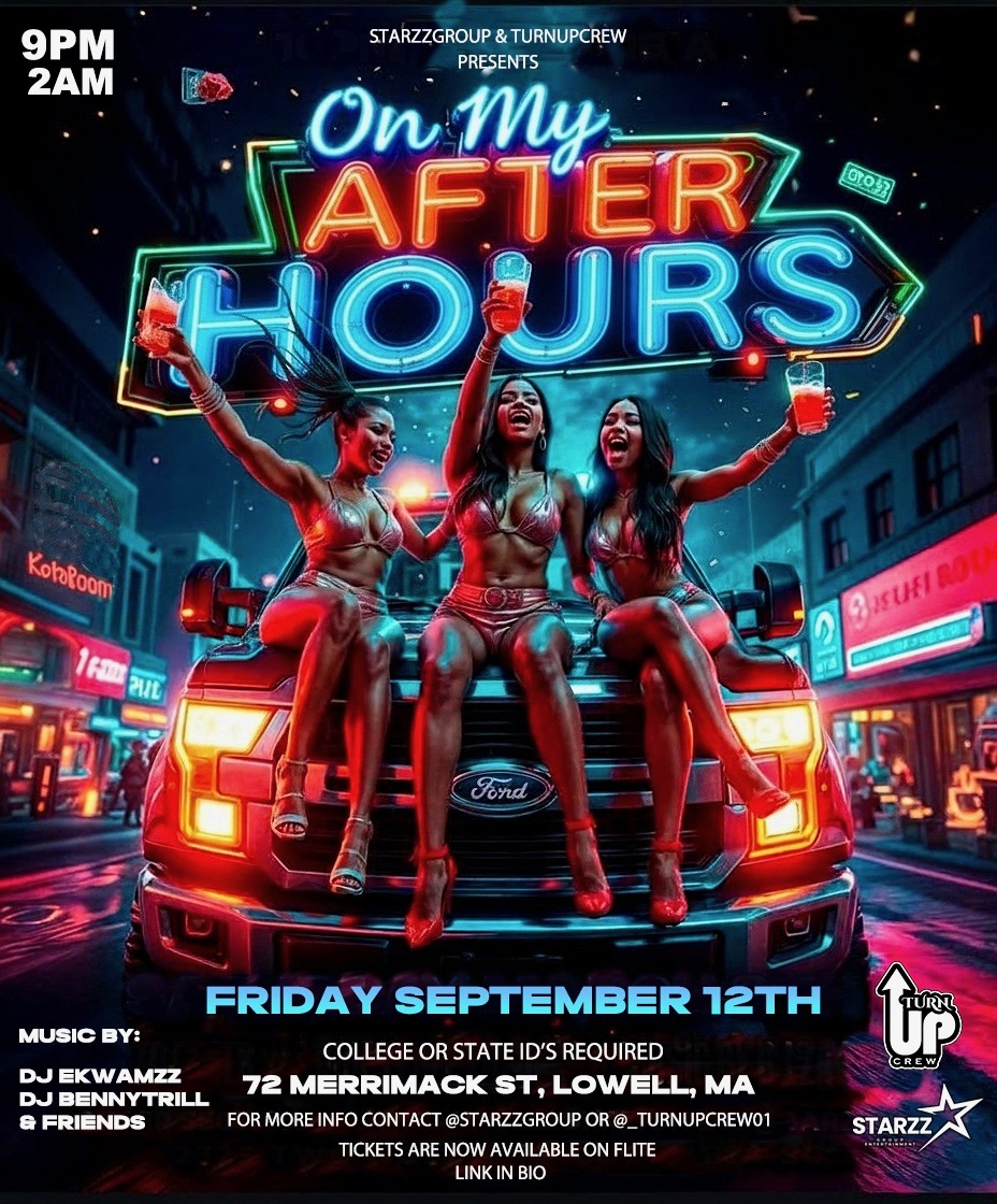 Event Name: On My After Hours Date: Friday, September 12th Time: 9:00 PM – 2:00 AM Location: 72 Merrimack St, Lowell, MA Music By: DJ Ekwamzz, DJ BennyTrill & Friends Entry Requirement: College or state ID required Organizers: Starzz Group & TurnUpCrew