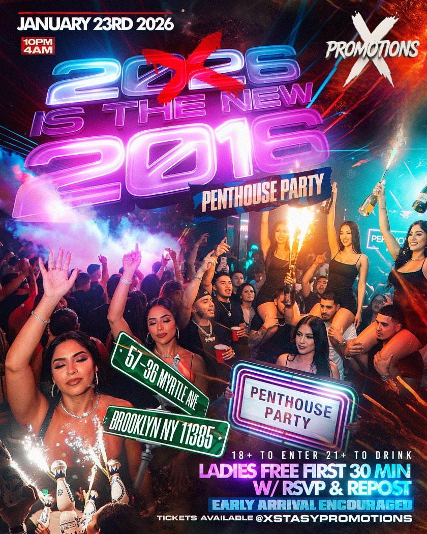 2026 IS THE NEW 2016 PENTHOUSE PARTY 18+ TO ENTER 21+ TO DRINK 👸🏽LADIES FREE FIRST 30 MIN W/ RSVP & REPOST 📍LOCATION : 57-36 MYRTLE AVE BROOKLYN NY 11385 🗓️DATE : JANUARY 23RD 2025 ⏰TIME : 10PM - 4AM EARLY ARRIVAL ENCOURAGED TICKETS AVAILABLE@XSTASYPROMOTIONS