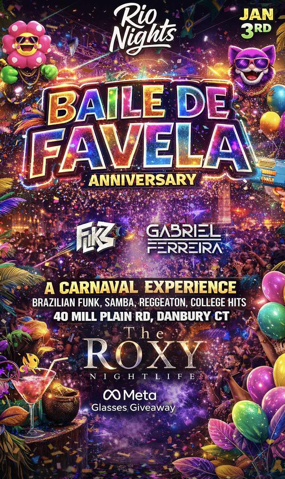 Rio nights presents 1 year Anniversary party at The Roxy Nightclub Jan 3rd. First Saturday of the new year🤩🎉. 🗓️January 3rd 2026 📍40 Mill Plain RD, Danbury CT WHAT TO EXPECT: 👓Meta Glasses giveaway 🎧2 DJ’s 🤖LED Robot 🦄Enchanted decorations 💃Dancers 💨c02 show 🎉Confetti show 💰and a lot more! (ALL SALES ARE FINAL)
