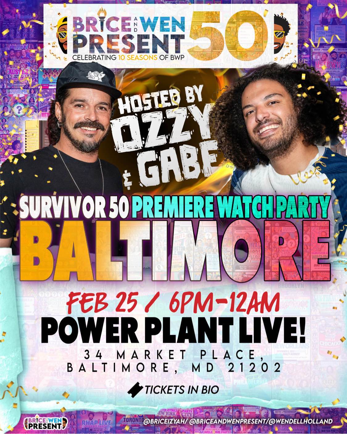 34 Market Pl, Baltimore, MD 21202, USASurvivor 50’s Ozzy Lusth and Survivor 47’s Gabe Ortis are hosting an epic Survivor 50 Premiere Watch Party at Power Plat Live in Baltimore! Come party with us and our reality friends as we kick off Survivor’s 50th season on February 25 from 6-12! We will see you there!
