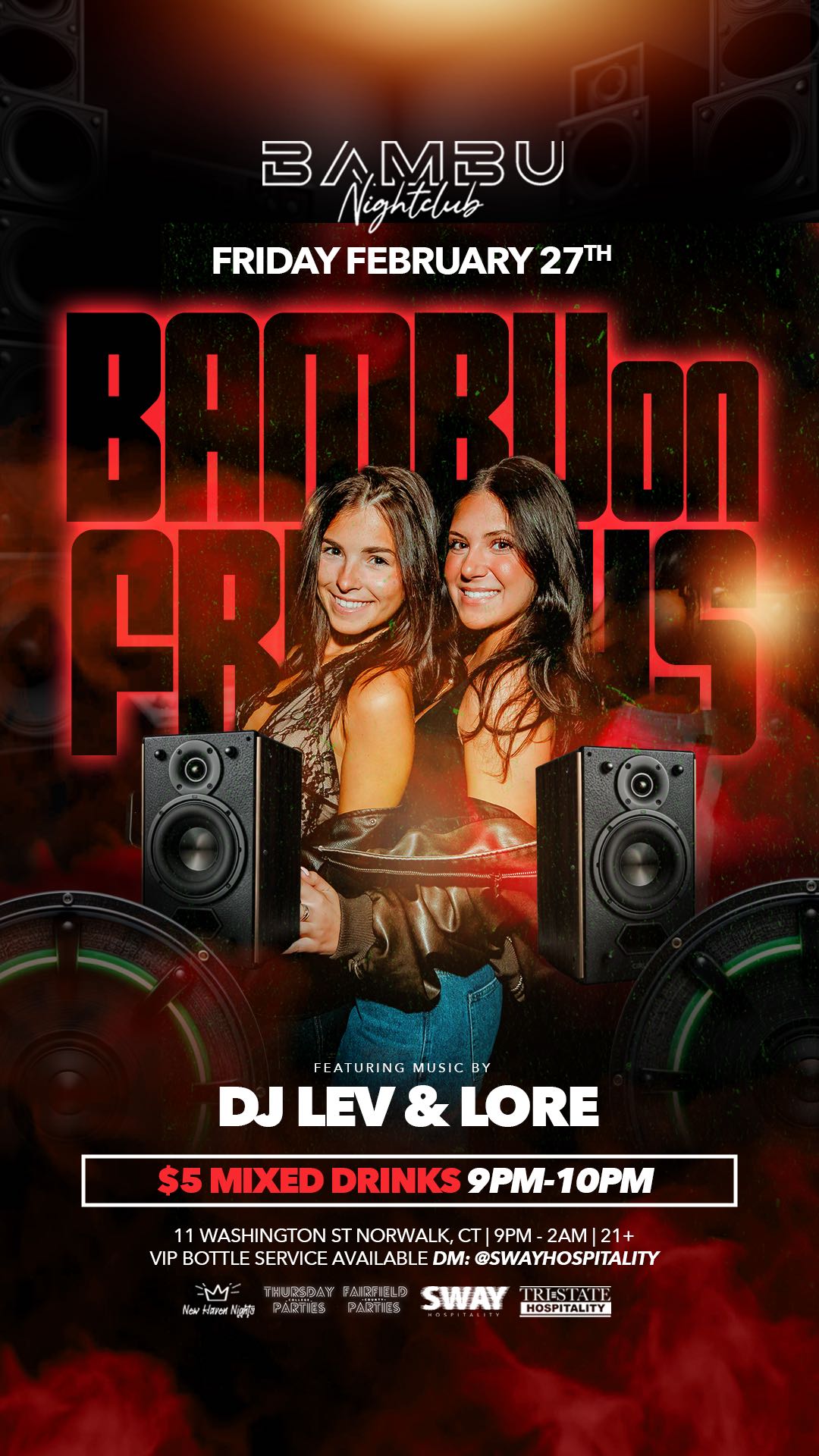 Bambu Friday’s Norwalk’s Newest Go-To Friday What To Expect: -> 800 Person State of The Art Nightclub -> Sounds by Special Guest DJ -> Discounted VIP BOTTLE SERVICE AVAILABLE (DM: @Swayhospitality) -> 21+ Event Lock in online to secure your spot in, and get in right away!