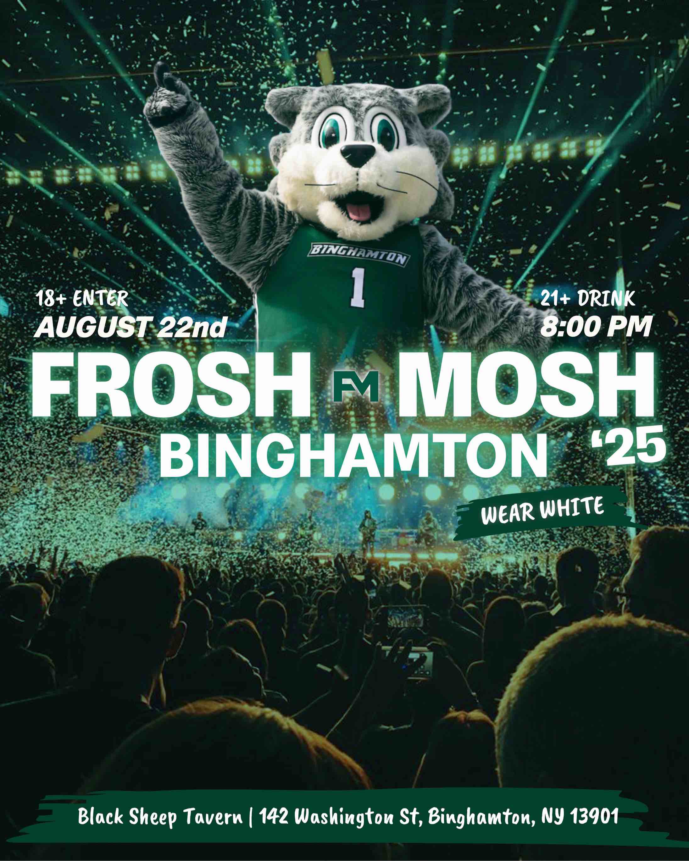 142 Washington St, Binghamton, NY 13901, USAFRESHMEN BEARCATS 🐻 We have been hounded for YEARS, and we FINALLY. listened. It’s time for the best SUNY hands down (🤬 Albany) to meet the #1 off campus freshmen event in the nation 🤝 Your freshmen year starts HERE. Get ready to rage the night away while meeting your newest freshman friends at one of Bing’s top venues, Black Sheep. Tick...