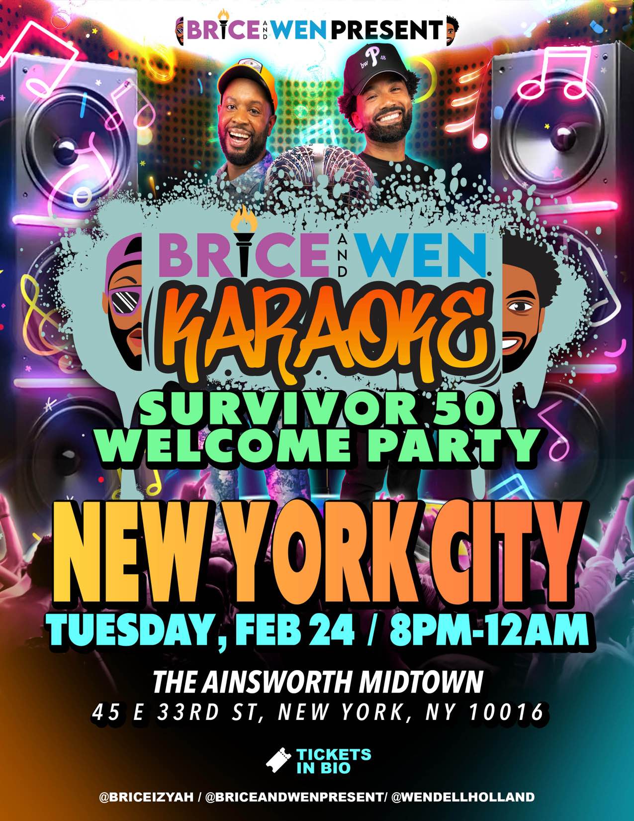 Brice & Wen are hosting a Brice & Wen Karaoke Party on Tuesday 2/24 to kick things off in NYC for the Survivor 50 Premiere!