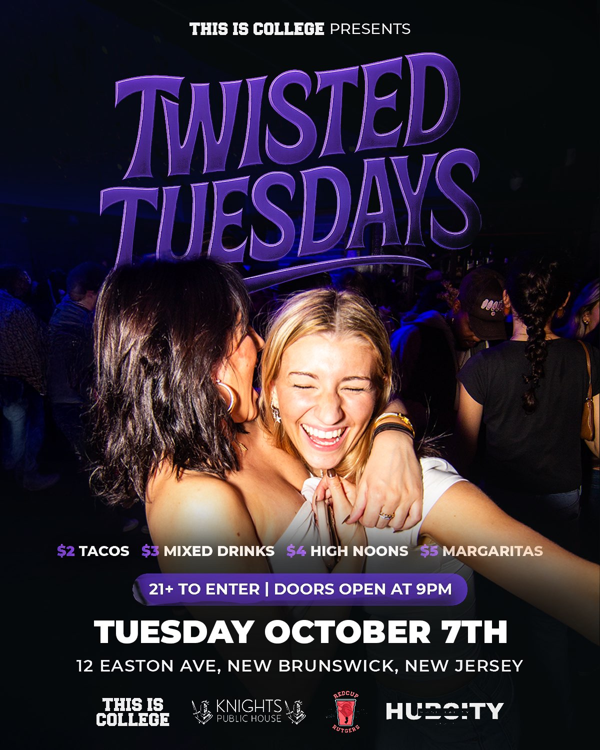 Twisted Tuesdays — New Brunswick’s Wildest College Night! This Is College is taking over Knights Public House for Twisted Tuesdays — the official Tuesday night party at Rutgers! ✅ $2 Tacos ✅ $3 Mixed Drinks ✅ $4 High Noons ✅ $5 Margaritas 📍 12 Easton Ave, New Brunswick, NJ ⏰ Doors open at 9 PM 🔞 21+ to enter Expect a packed dance floor, ch...