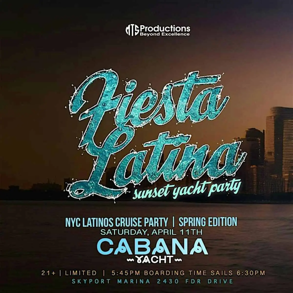 Fiesta Latina Sunset Yacht Party NYC brings a high-energy Latin nightlife experience to the water this April 11. Hosted by MTS Productions, this sunset cruise aboard the Cabana Yacht offers a perfect mix of music, dancing, and iconic NYC skyline views. Enjoy golden hour as you sail through the East River, surrounded by a vibrant crowd and nonsto...