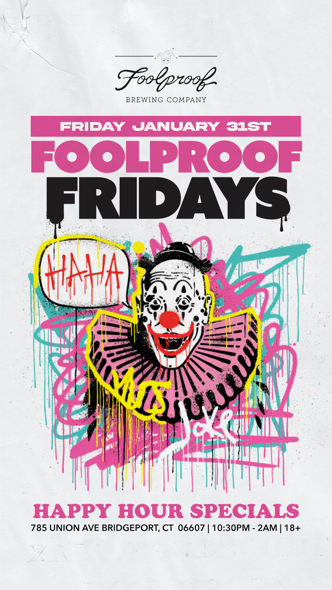 Foolproof Fridays: January 31st We’re back this Friday at The Newest Fairfield U/SHU Nightlife Destination What To Expect: 👉 18+ Event 🍻 College Happy Hour 10:30-11:30PM 🎧 Sounds by Mano ⚡️Fairfield’s Newest College Hotspot