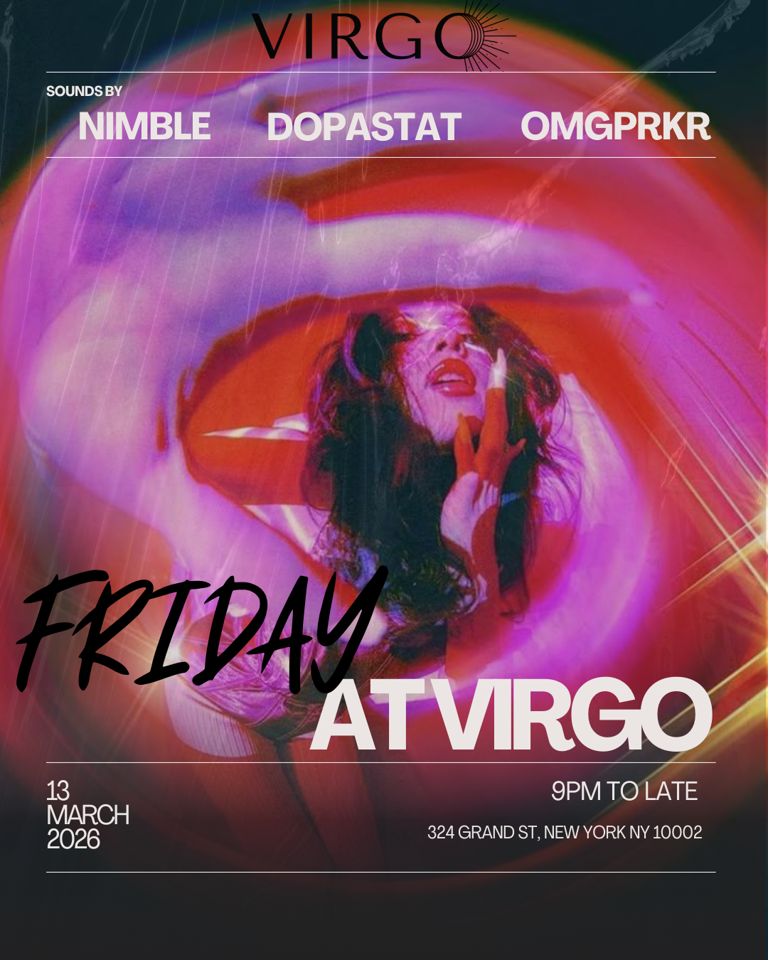 Virgo brings a standout lineup featuring NIMBLE, DOPASTAT, and OMGPRKR, setting the tone with house-driven sound and a dance floor that stays moving from open to close. Expect deep grooves, late arrivals that turn into early mornings, and a room filled with the crowd that knows ...