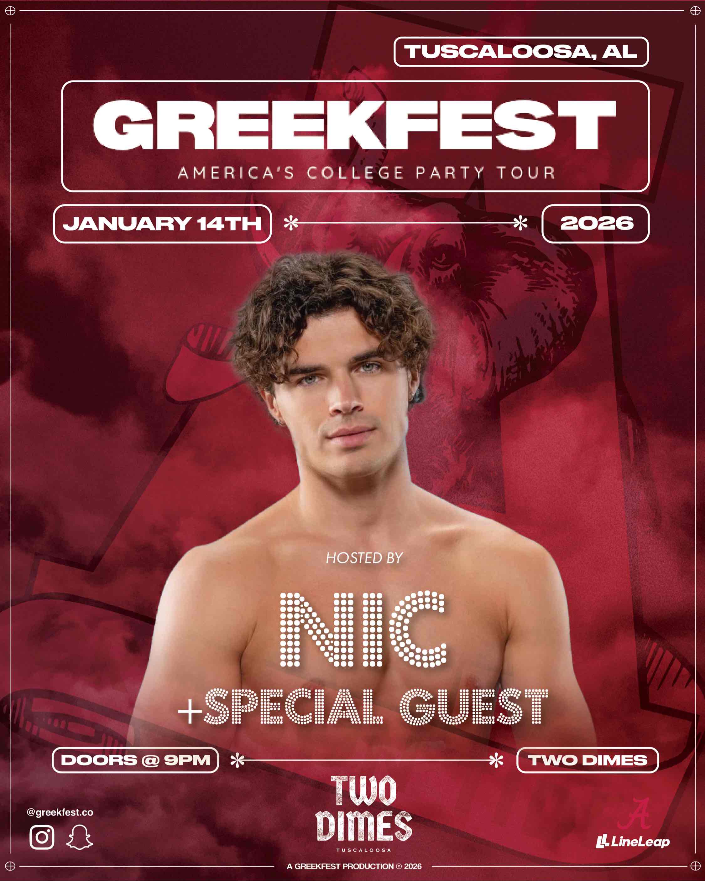 GreekFest is coming to Tuscaloosa with Love Island star Nic Vansteenberghe @ Two Dimes! Buy your ticket before the show is SOLD OUT! GreekFest welcomes you to an everyday celebration with a variety of different events, Top DJ's, and atmospheres of enjoyment. Our sole mission is to provide an incredibly fun, memorable, and energetic experience th...