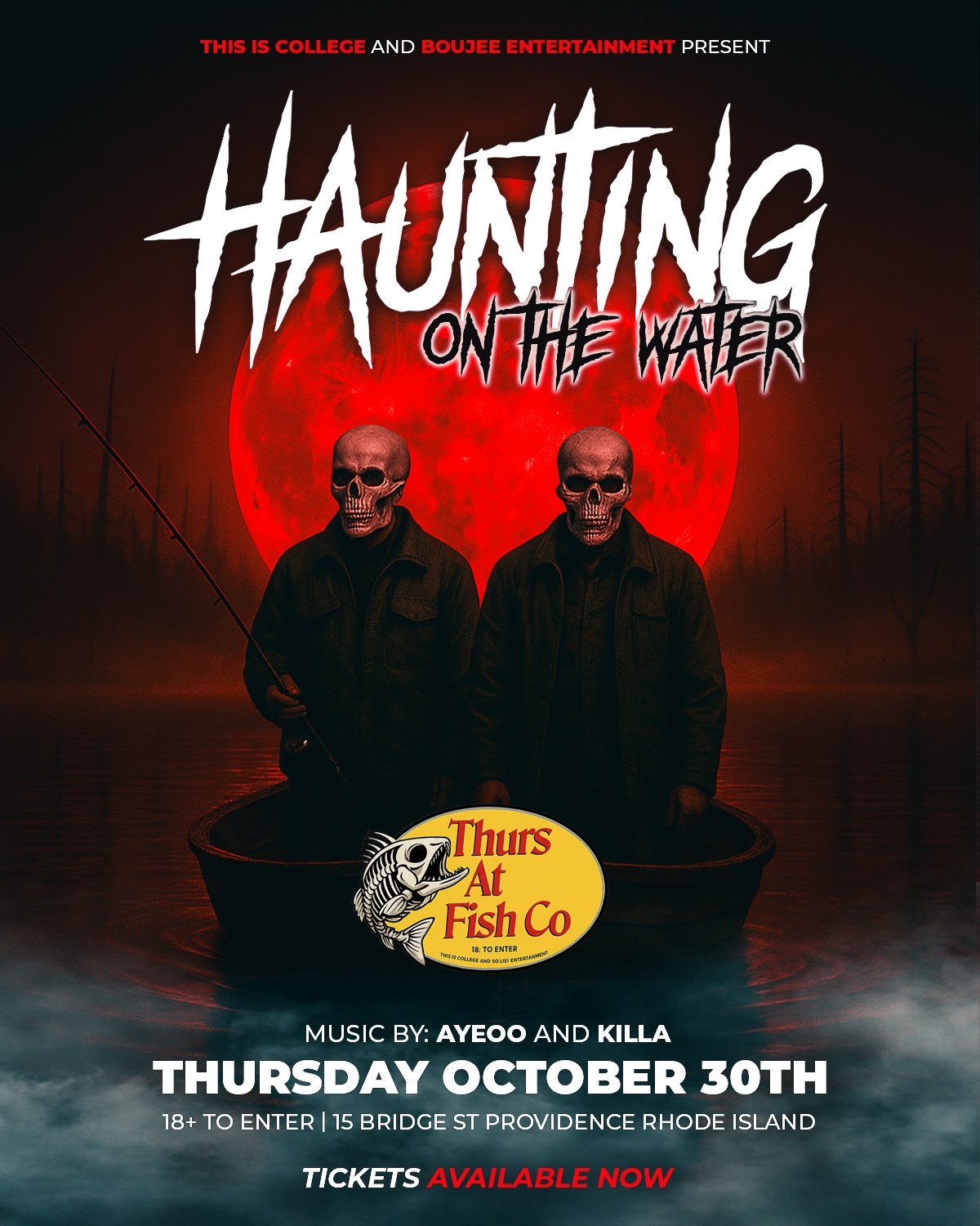 15 Bridge St, Providence, RI 02903, USATHIS IS COLLEGE x BOUJEE ENTERTAINMENT Haunting on the Water – Halloween Party 📍 Fish Co. | 15 Bridge St, Providence, RI 📅 Thursday, October 30th, 2025 | 18+ Rhode Island’s #1 Thursday Night! Halloween Party returns! Step aboard the haunted waters of Fish Co. for a night filled with chilling vibes, insane music, and an atmosphere you’ll neve...