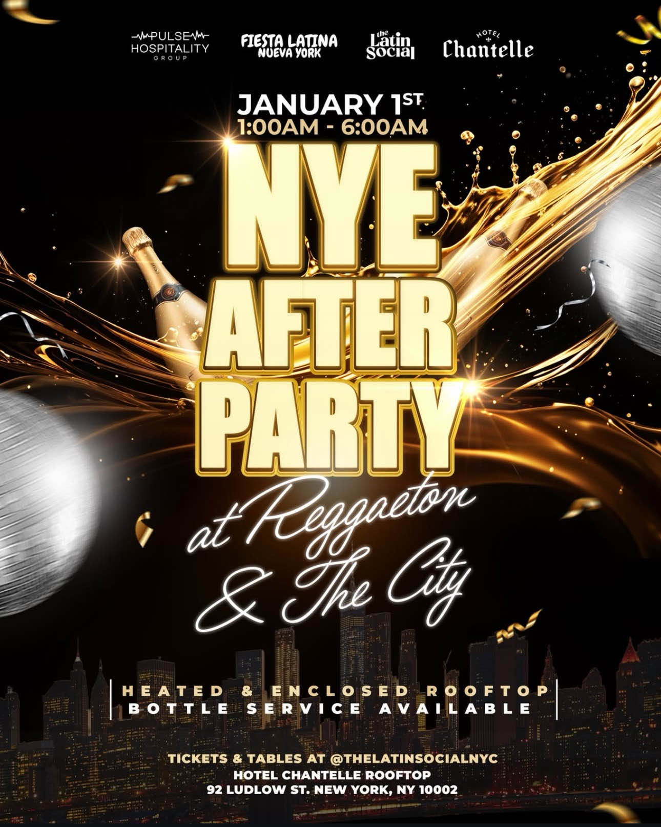 NYE After Party: Reggaeton & The City at Hotel Chantelle (1AM–6AM) Keep the party going into 2026 at Reggaeton & The City, NYC’s ultimate NYE After Party from 1AM to 6AM at the iconic Hotel Chantelle. Dance under the Manhattan skyline to nonstop Reggaeton, Latin hits, and dembow in a sophisticated, high-energy atmosphere designed for nightlife l...