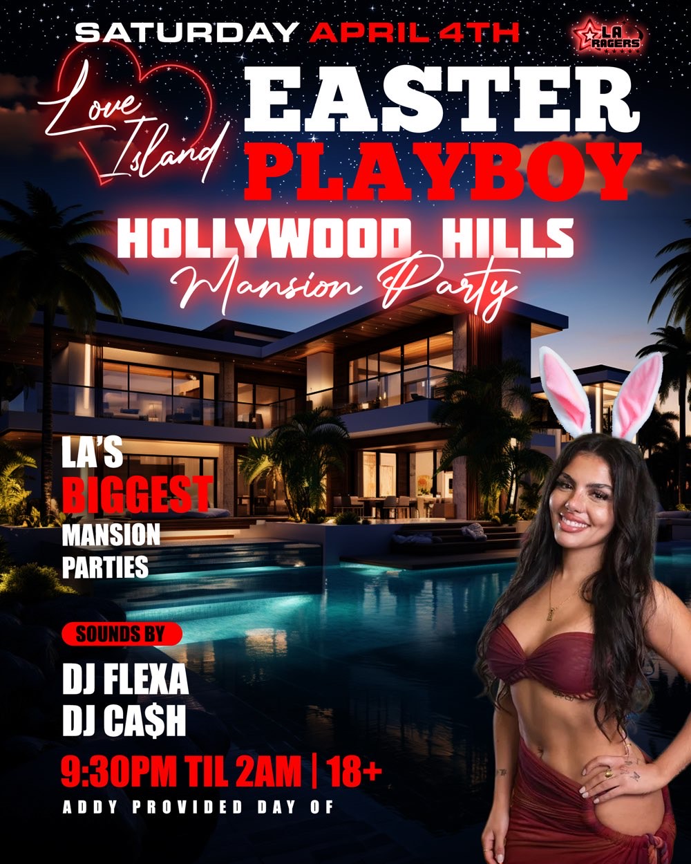 π΄ PLAYBOY EASTER MANSION PARTY β CASA AMOR EDITION π΄ LA is back outsideβ¦ and ready for the BIGGEST Easter Mansion Party in Los Angeles π°π₯ This Saturday, LA Ragers is taking over a Hollywood Hills Mansion for a Playboy x Casa Amor experience you donβt wanna miss β¨ π CASA AMOR VIBES π° PLAYBOY THEME π―ββοΈ Bring your best BUNNY OUTFIT π SATUR...