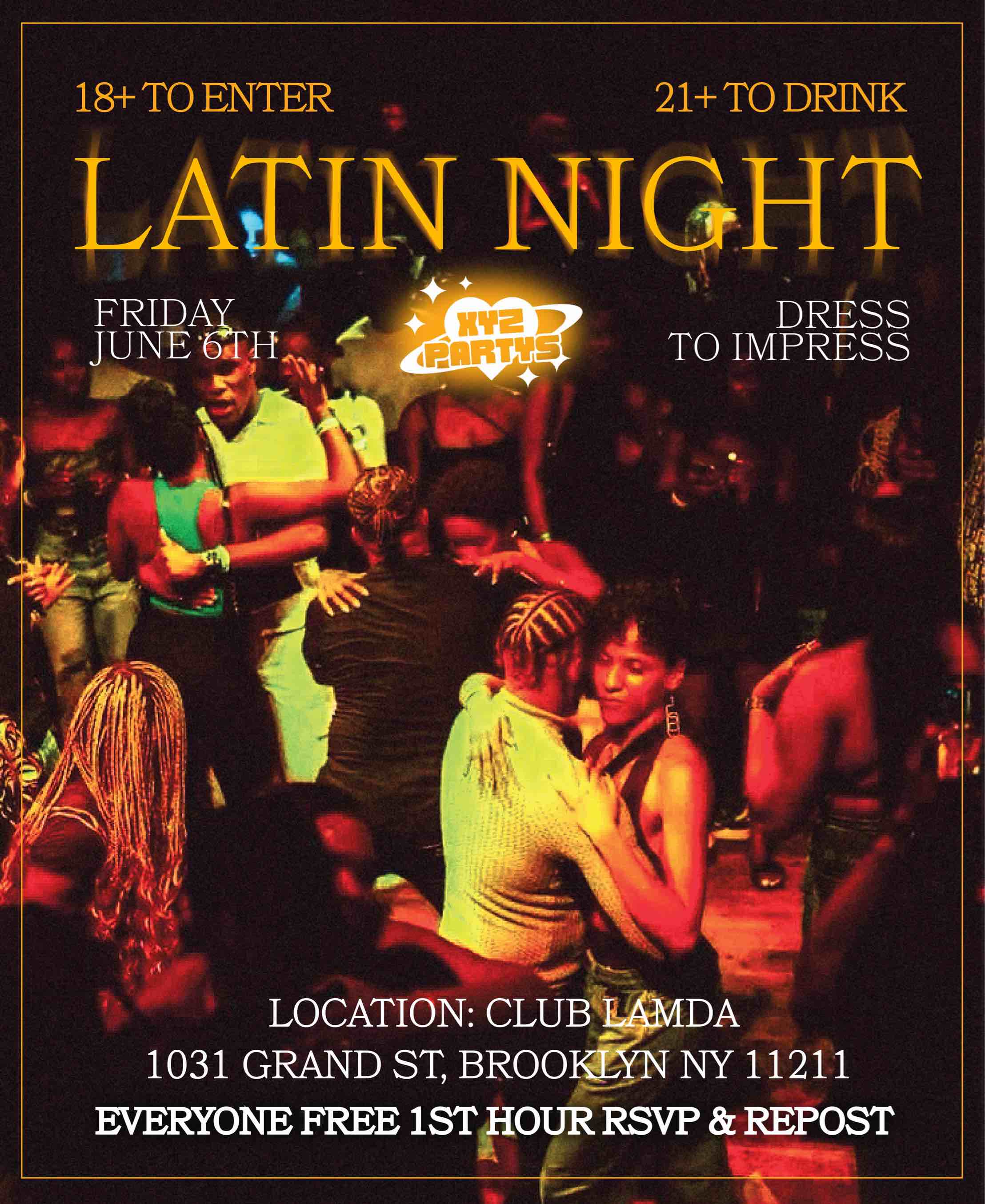 Latin Night 👯♀️ (18+) Tonight Friday June 6th 👀 Everyone FREE 1st HOUR RSVP & REPOST 🤯 • 18+ to ENTER & 21+ TO DRINK 🍸 DRESS CODE : DRESS TO IMPRESS ✨ Location: 1031 Grand St Brooklyn, NY 11211 • ❤️HOTTEST 18+ Latin PARTY IN NYC❤️ ❗️TICKETS WILL BE 100% SOLD OUT❗️