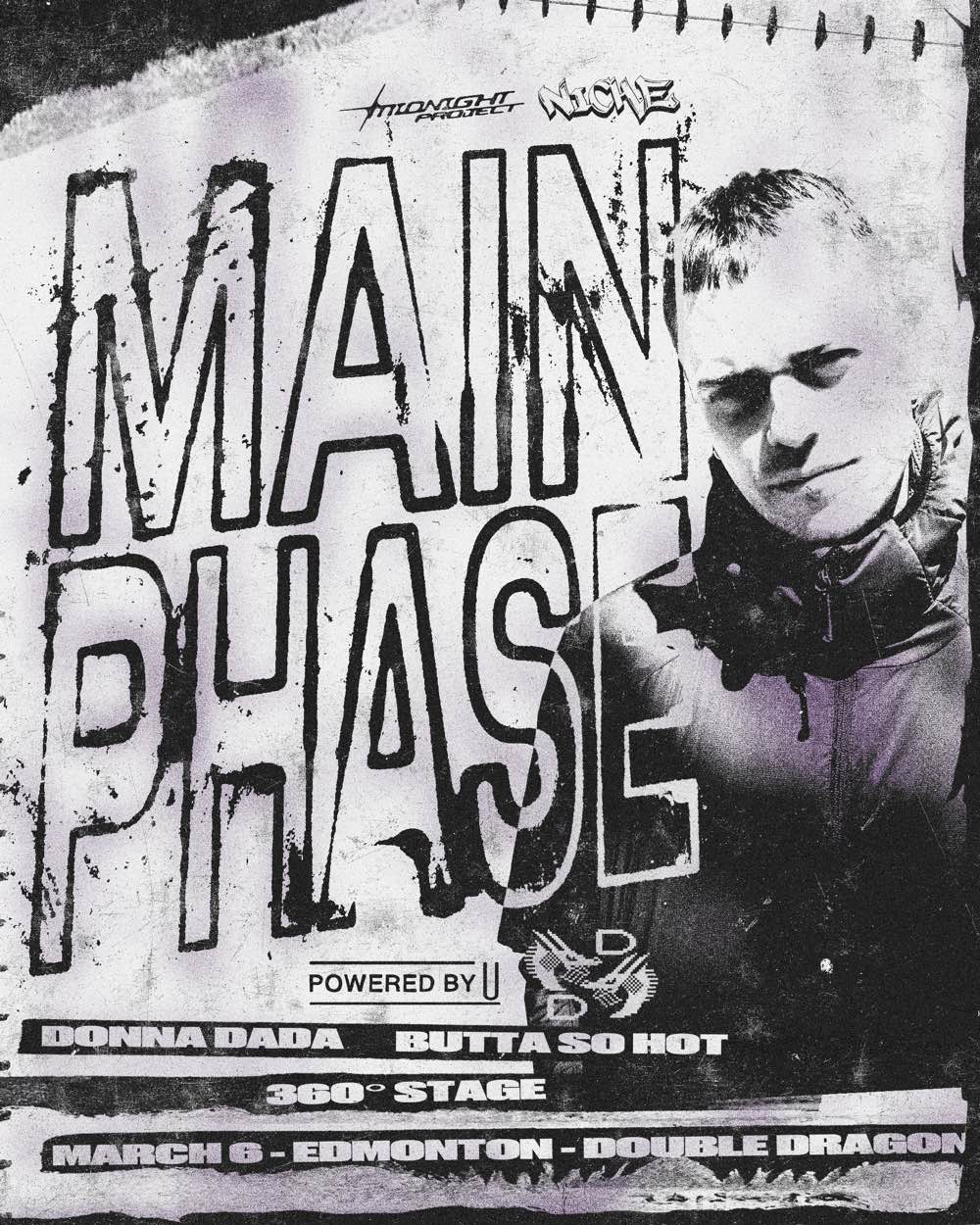 Main Phase will be entering the fray for the first ever collaborative event between Midnight Project and Niche, in Edmonton on Friday, March 6th at Double Dragon for his first Western Canadian tour featuring top audio-visual production.