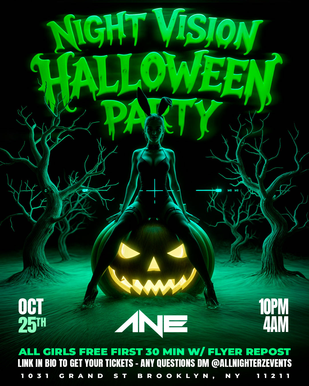 NIGHT VISION HALLOWEEN PARTY (18+) 👸🏽ALL GIRLS FREE FIRST 30 MIN W/ FLYER REPOST & RSVP 📍 1031 GRAND ST BROOKLYN, NY 11211 📅SATURDAY, OCT 25TH, 2025 ⏰10:00 PM – 4:00 AM 📇18+ TO ENTER 21+ TO DRINK 📩ANY QUESTIONS DM @allnighterzevents
