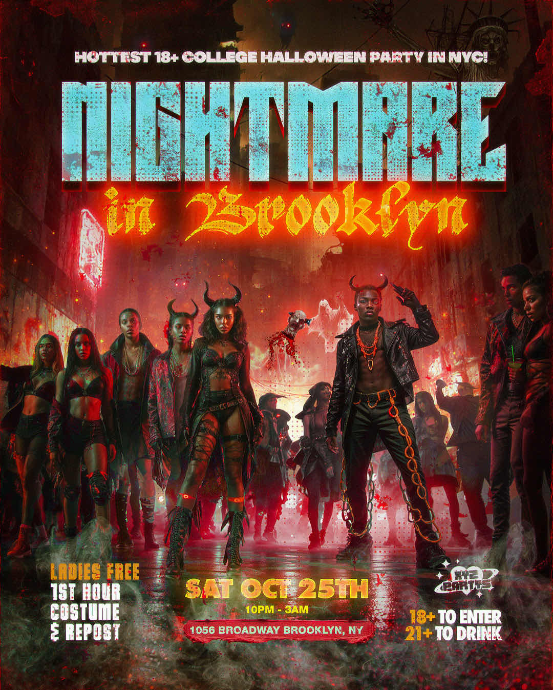 Nightmare in Brooklyn ๐ป (18+) Tonight Saturday October 25th ๐ย LADIES FREE 1st HOUR Costume & Repostโ๏ธ โข 18+ to ENTER & 21+ TO DRINK ๐น TIME: 10PM - 4AM ๐ (Tulum Brooklyn) DRESS CODE: Costumes ๐น (500$ Contest) Location: 1056 Broadway Brooklyn, NYย ย 11221 โข ๐ป Hottest 18+ Halloween College Party ๐ป