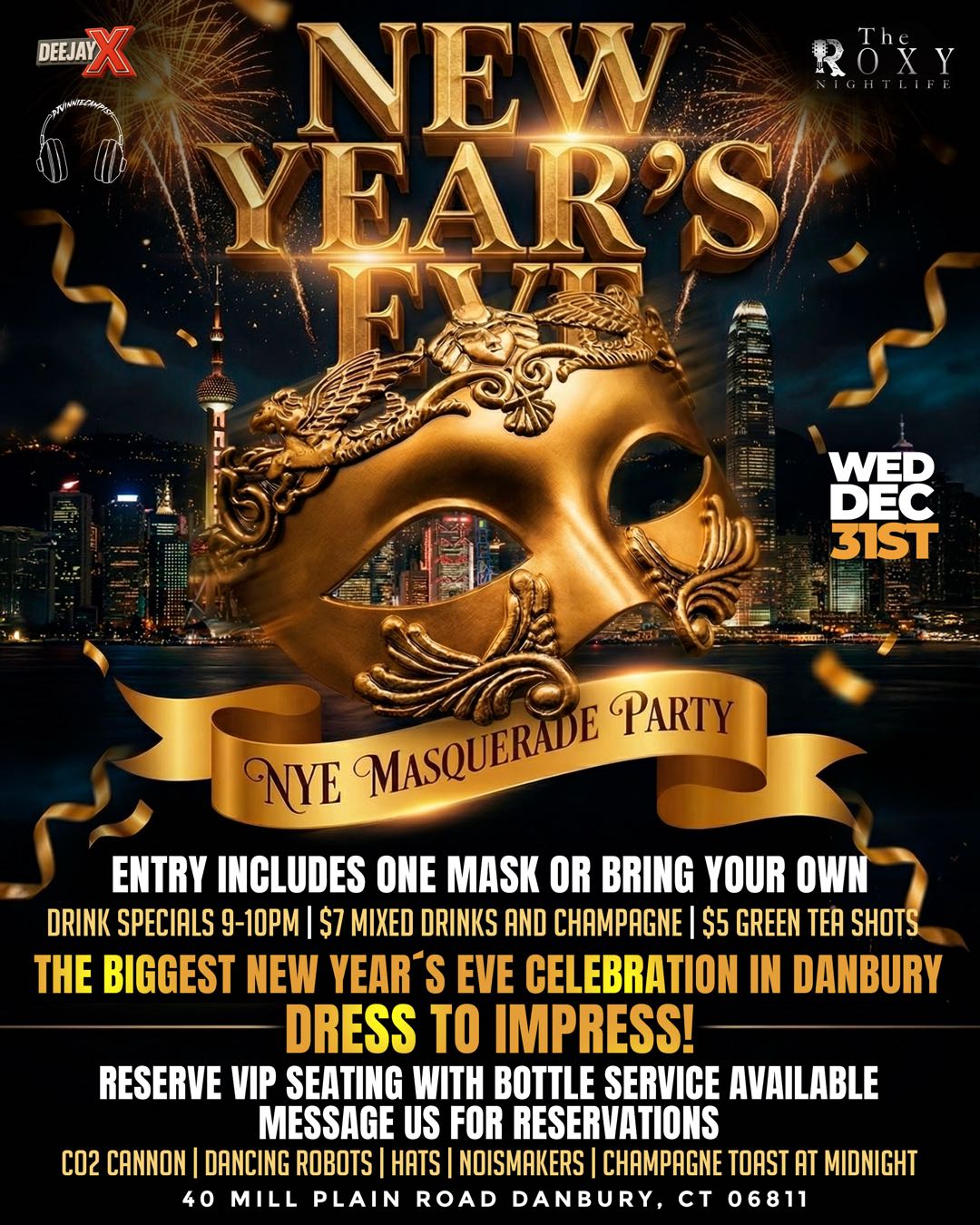 Danbury’s BIGGEST NYE party is at The Roxy! Masquerade party. Wear your own mask or one will be provided at the door. Two DJs spinning all of your favorite dance music. Whether it’s top 40, hip-hop, Latin or Brazilian we’ve got it covered for everyone. Hats, noisemakers, free champagne toast at midnight. Confetti and CO2 guns. Insane drink...
