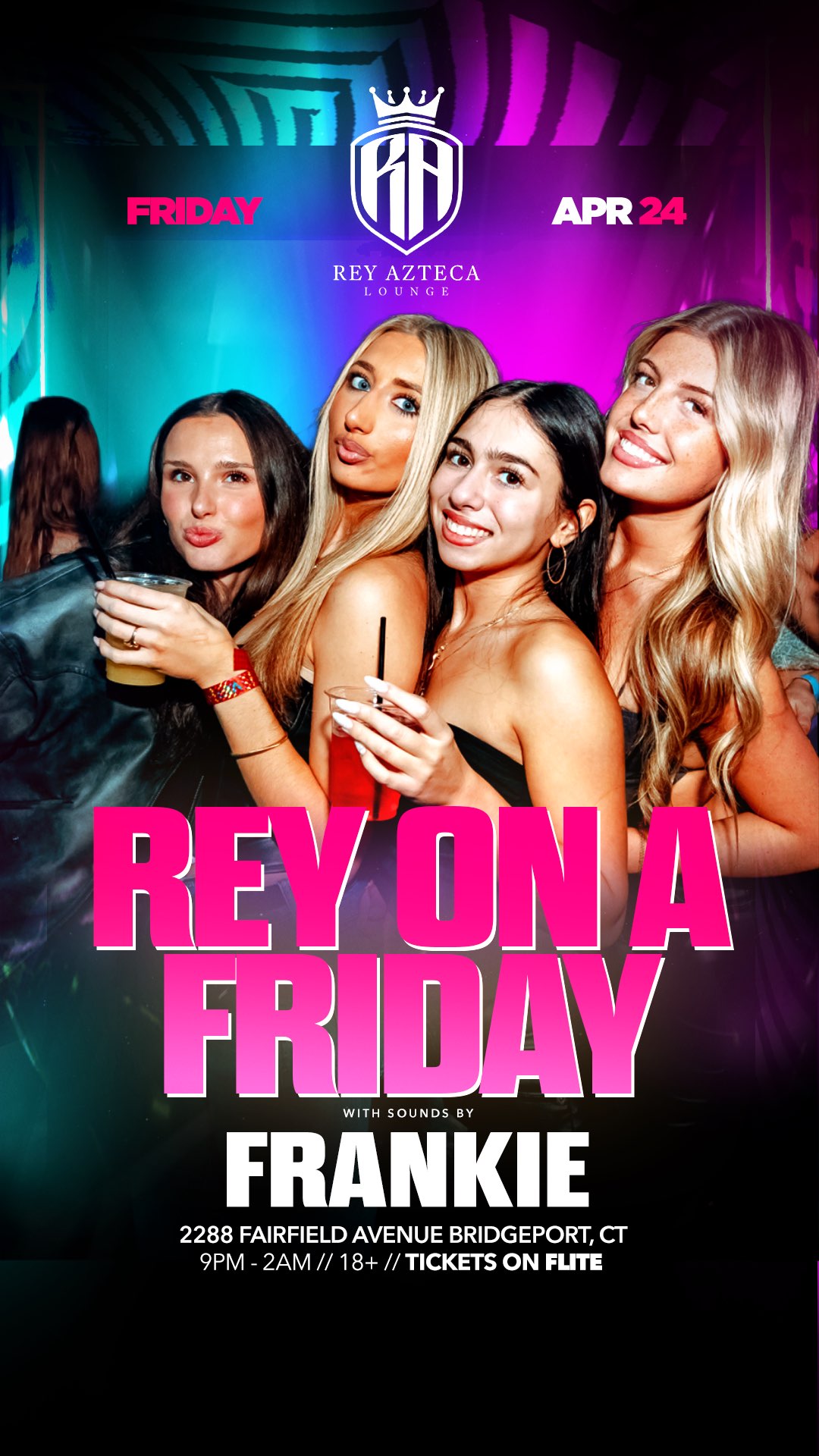 Rey Friday’s: April 24th - Come kick-off Friday at Fairfield County’s #1 Destination What To Expect: -> Limited to 350 People 🎧 Sounds by DJ Frankie 🍹$3 Beers x $5 Mixed Drinks 9:00PM-10:15PM 🏀 Games on TVs 👉 18+ To Party, 21+ To Drink On Friday, We Rey.
