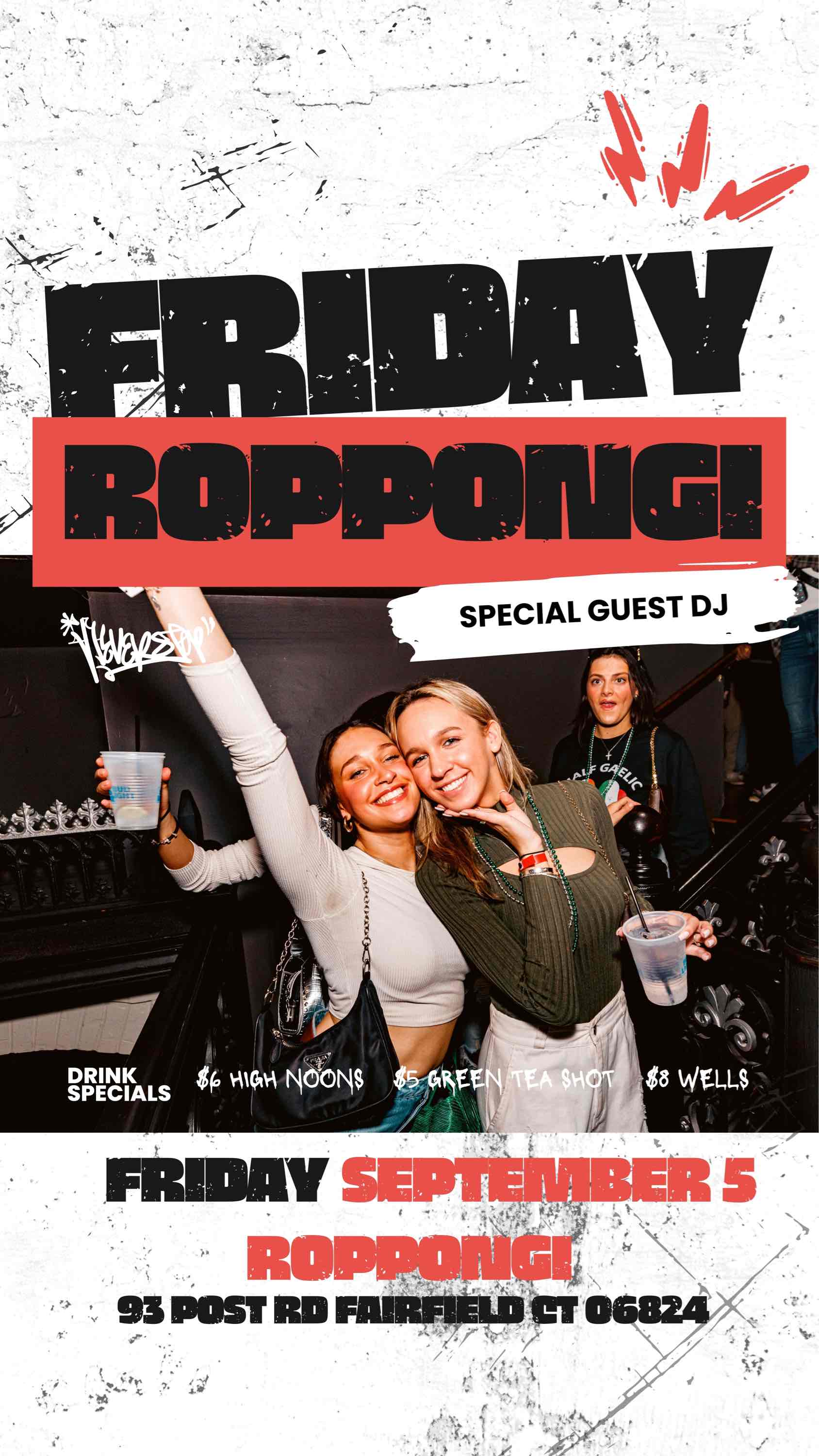 Roppongi, Post Road, Fairfield, CT, USARoppongi Fridays?... YUP Join us this Friday, September 5th @ Roppongi in Fairfield for the most INSANE Friday party of the semester. With great drink deals & vibes! What To Expect: 👉350+ Attendees (Tickets Highly Recommended, This WILL Sell Out ) 🍹College Drink Specials All Night ($6 High Noon, $8 Mixed Drinks, $5 Green Tea Shots) ...