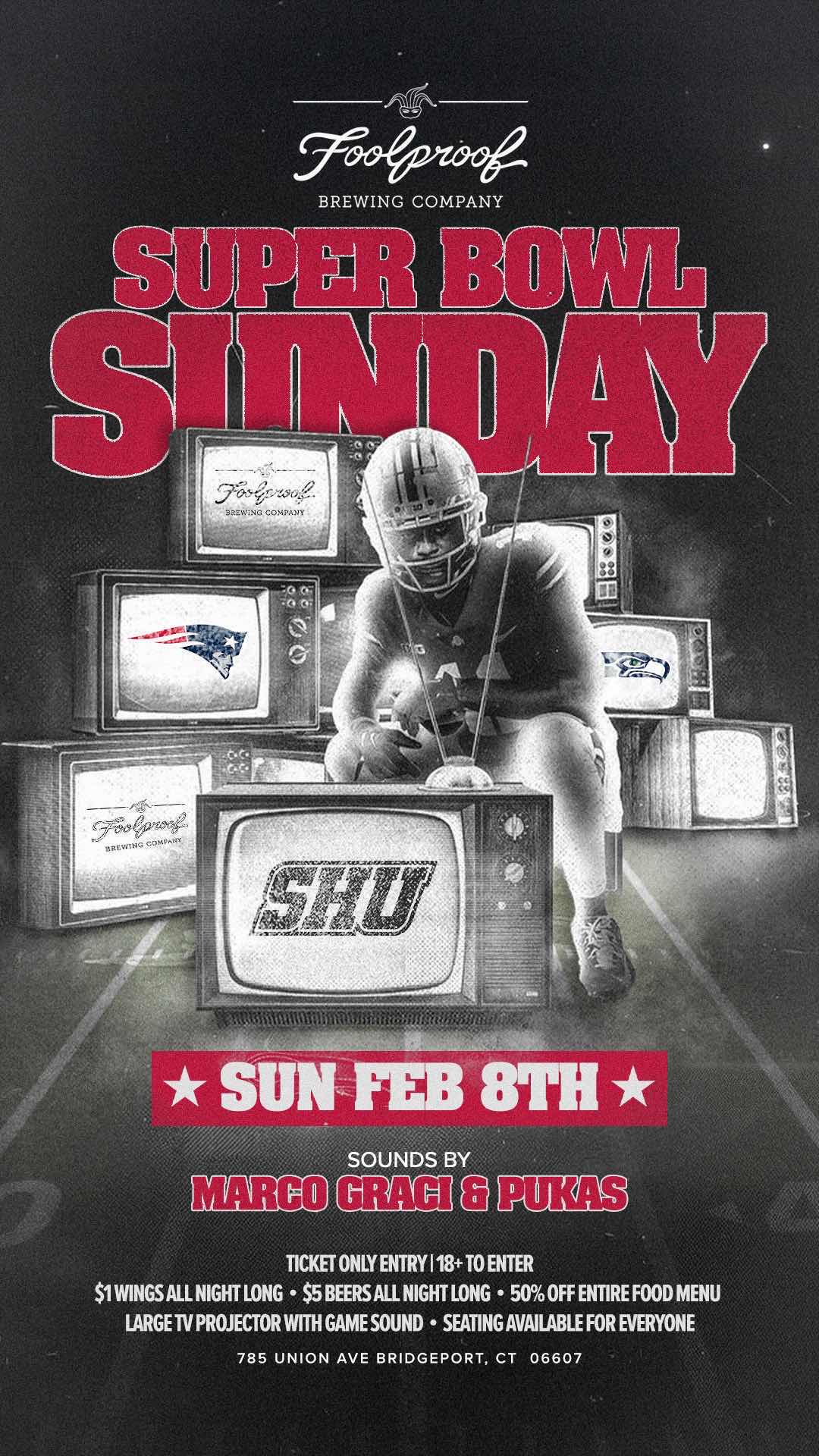 SHU Super Bowl Sunday @ Foolproof Brewing โจ Hawks vs. Pats, who ya got? Regardless.. come to Foolproof this Super Bowl Sunday and experience the Big Game with MASSIVE Projector, Game Sound, Small Bites, & Discounted Drinks! โจ ๐ Foolproof Brewing ๐๏ธ Sunday, Feb 8th โฐ4:00PM-12:00AM ๐งSOUNDS BY Marco Graci & Pukas โจ ** Blowout Drink & Food Deals ...