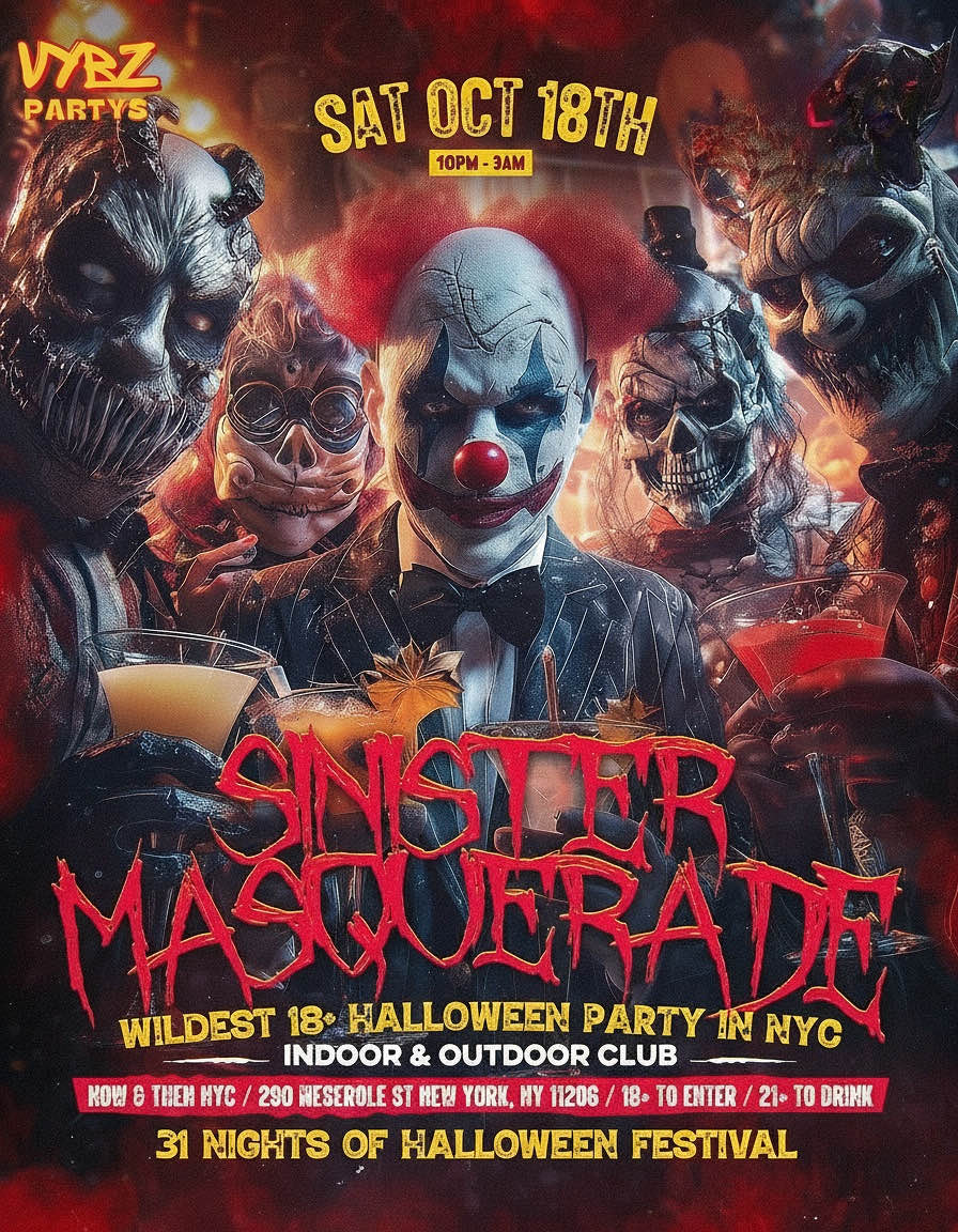 Sinister Masquerade ๐ (18+) This Saturday October 18th ๐ป LADIES FREE 1st HOUR Costume & Repost โจ โข 18+ to ENTER & 21+ TO DRINK ๐น TIME: 10PM - 4AM ๐ (Now & Then NYC) DRESS CODE: Costumes ๐น (500$ Contest) Location: 290 Meserole St New York, NY 11206 โข ๐ Wildest 18+ College Halloween Parties ๐ ๐ป 31 Nights of Halloween Festival ๐ป