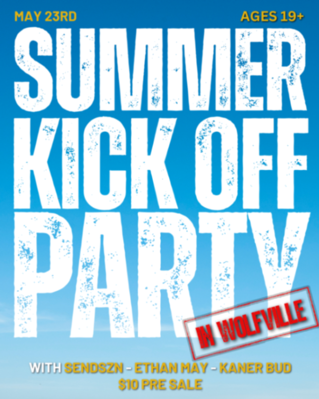 Get ready for the Biggest summer kick off party in Wolfville with SENDSZN, ETHAN MAY & KANER BUD🔥