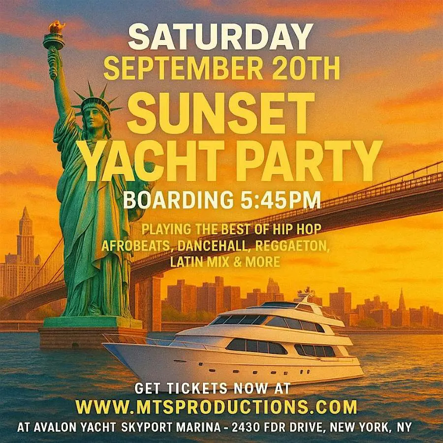 Get ready for the ultimate sunset experience on the water. On Saturday, September 20th, 2025, the Avalon Yacht departs from Skyport Marina, 2430 FDR Drive, New York, NY for an unforgettable evening cruise. Boarding begins at 5:45 PM, with sailing from 6:30 PM – 10:00 PM.