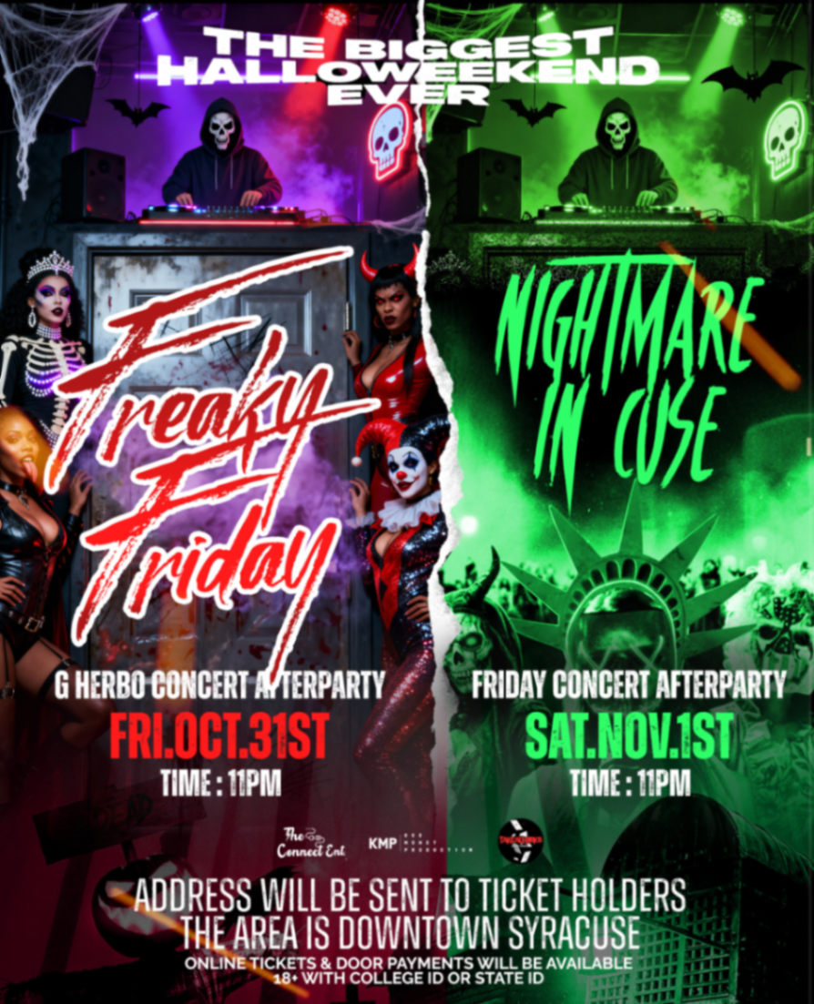 Syracuse has NEVER had a true Homecoming Weekend until now. We're putting the city ON THE MAP with the BIGGEST HALLOWEEKEND Upstate has ever seen. Syracuse, Halloween weekend Will NEVER be the same TWO nights, legendary performances, crazy energy, and the livest crowd...