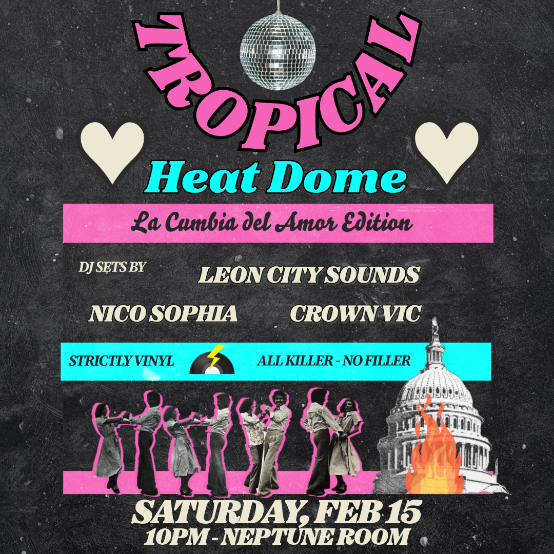 5405 Georgia Ave NW, Washington, DC 20011, USAYour favorite all vinyl vintage tropical party is back! Tropical Heat Dome “La Cumbia Del Amor Edition” at Neptune Room with DJs Leon City Sounds, Crown Vic and Nico Sophia. 10PM / No Cover / No Requests