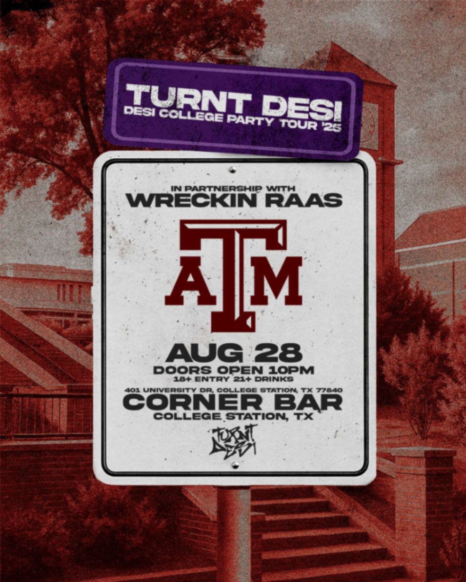 Turnt Desi x Wreckin’ Raas x Chi Psi present the Official TAMU Back to School Bash — going down at Corner Bar!