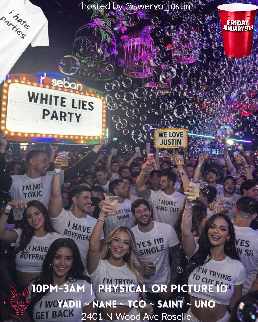 ๐ฅ White Lies Party ๐ฅ Everybody lyingโฆ but the party is REAL ๐ฎโ๐ฅ White tees, wild confessions, and drinks up all night. If you know, you know โ and if you donโt, pull up. ~~~~~~~~~~~~~~~~~~~~~~~~~~~~~~ Presented by @playboy.entt Hosted by:Swervo_justin ~~~~~~~~~~~~~~~~~~~~~~~~ ๐ Friday, January 9th โฐ 10PM โ 3AM ๐ 2401 Wood Ave, Roselle, ...