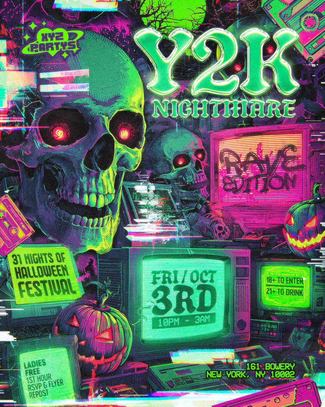 Y2K NIGHTMARE 👻 (18+) 📍This Friday October 3rd Ladies FREE 1st HOUR RSVP & REPOST ✨ • 18+ to ENTER & 21+ TO DRINK 🍹 TIME: 10PM - 4AM DRESS CODE: Y2K OUTFIT 👀 📍Location: 161 Bowery New York, NY 10002 🎃GET READY TO START THE NIGHTMARE🎃